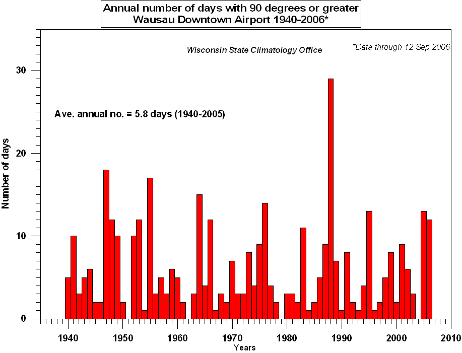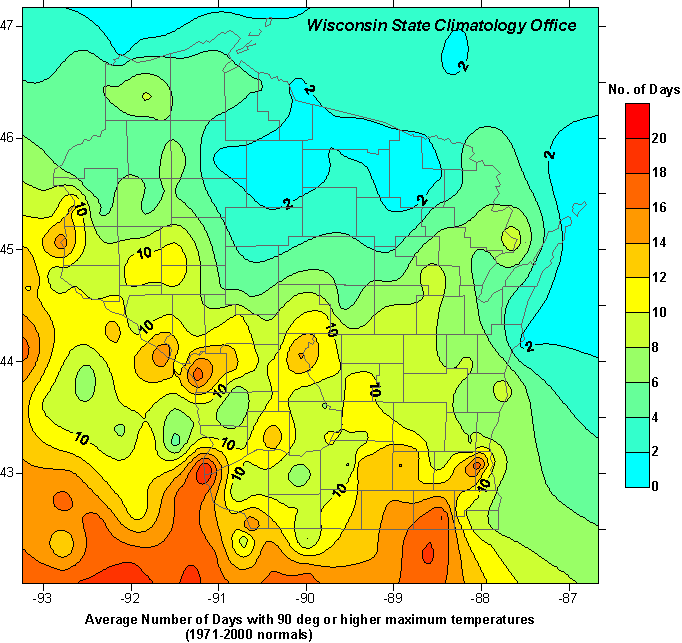 Long-term average values of the days and hours for area stations from the Rocky Mountains to the East Coast, where the Heat Index equals or exceeds threshold values ranging from 80°F to 115°F. Monthly and annual averages are available. [MRCC GIS Maps] (NOTE MRCC also has a selection of analyzed maps of the states to the east of Rockies that show the spatial distributions of calendar year totals of the average number of days with at least one hour with Heat Index readings exceeding specified threshold readings or for days with three or more hours with similarly specified heat index thresholds.)